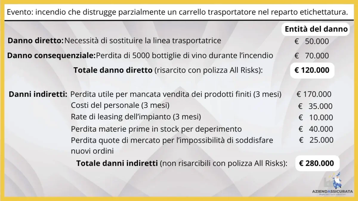 Come puoi notare, nonostante l’azienda fosse assicurata contro l’incendio, il danno indiretto per fermo della produzione le ha causato una perdita economica di oltre due volte superiore.